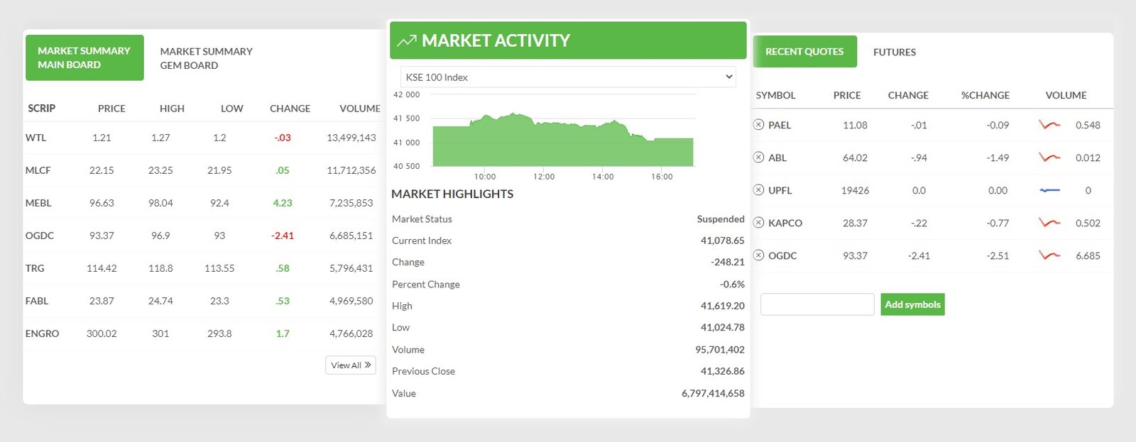 پاکستان اسٹاک ایکسچینج کا 100 انڈیکس 248 پوائنٹس کمی سے 41 ہزار 78 پر بند ہوا ۔ گزشتہ روز حصص بازار میں تیزی کا رجحان دیکھا گیا تھا ۔