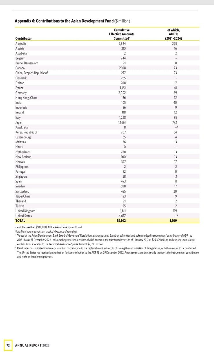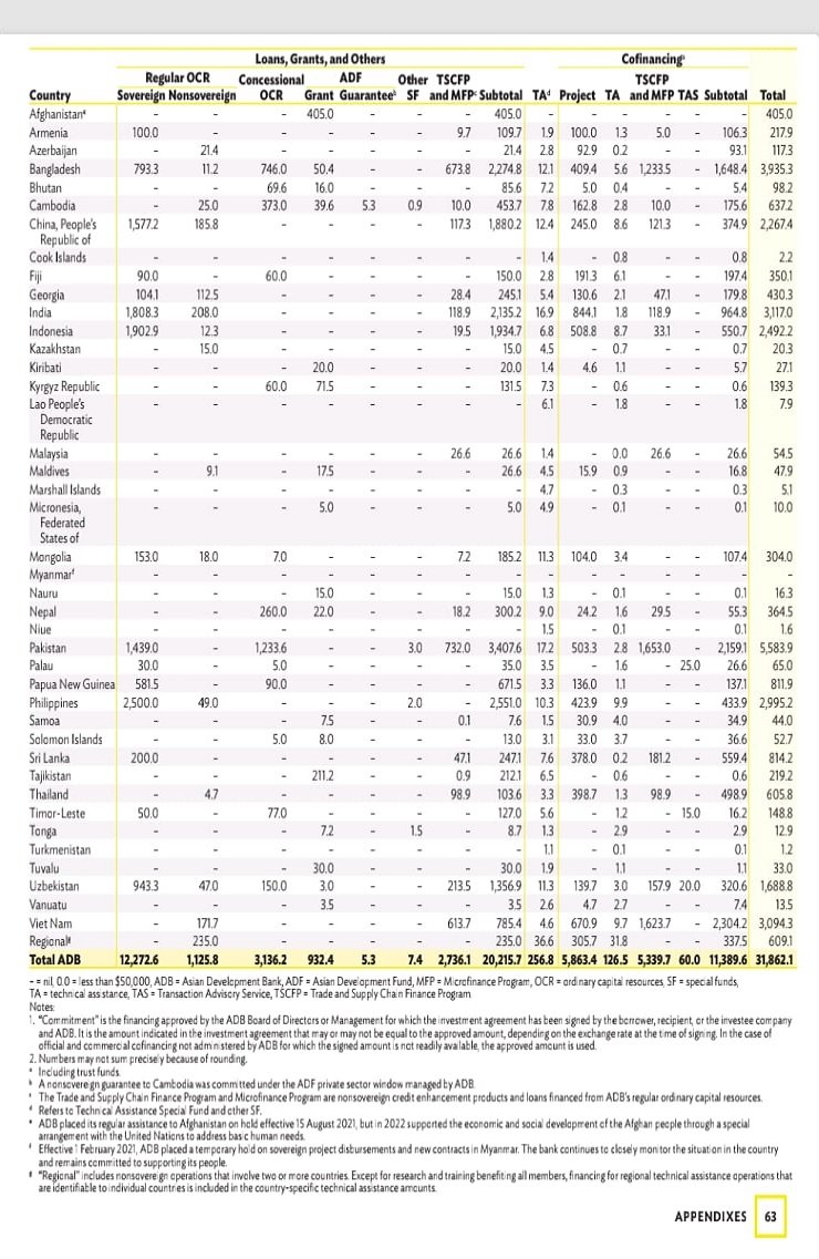 سال 2022 کے لیے ایشیائی ترقیاتی بینک کی سالانہ رپورٹ جاری کردی گئی ہے۔ جس کے مطابق ایشیائی ترقیاتی بینک نے ایشیا میں  31.8 ارب ڈالر کی پراجیکٹس فنانسنگ کی اور اس میں سے سب سے بڑا حصہ پاکستان کو دیا گیا۔