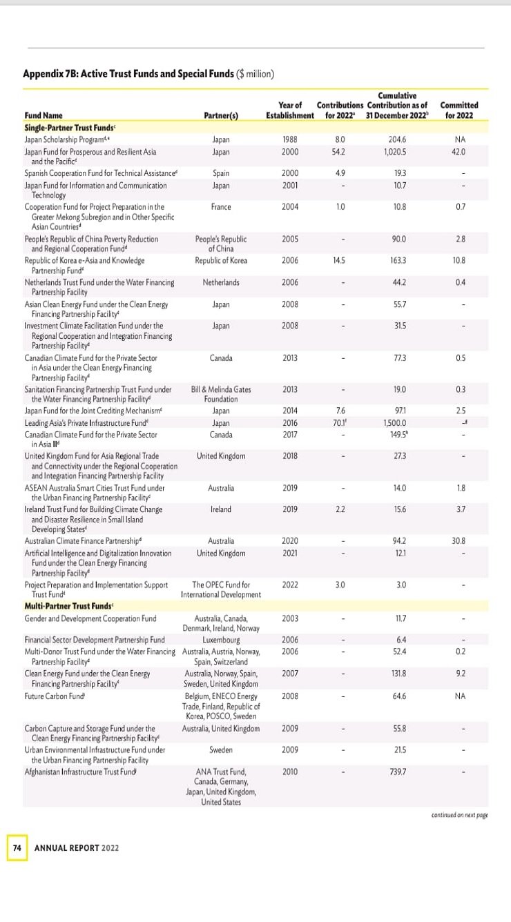 رپورٹ کے مطابق سال 2022 میں سب سے زیادہ فنڈنگ پاکستان کے لیے کی گئی۔ رپورٹ کے مطابق ایشیائی ترقیاتی بینک اور اس کے پارٹنرز نے پاکستان کو 5.5 ارب ڈالر کے پراجیکٹس دیئے، جبکہ 2.6 ارب ڈالر کے رعایتی قرضے دیئے گئے۔