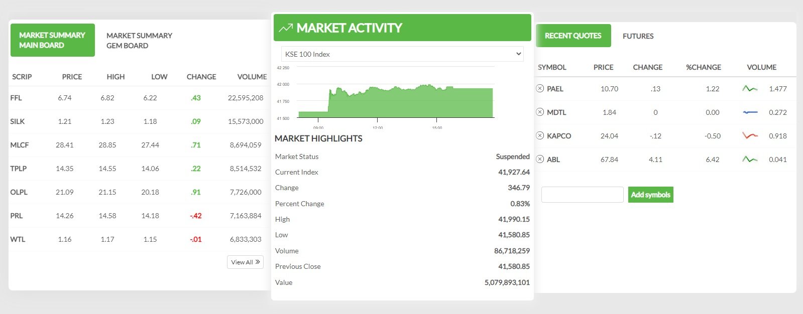 پیر کے روز حصص بازار میں تیزی رہی ۔ پی ایس ایکس کا 100 انڈیکس 346 پوائنٹس اضافے سے 41 ہزار 927 پر بند ہوا ۔ آج مارکیٹ میں 22 کروڑ شیئرز کا لین دین ہوا ۔
