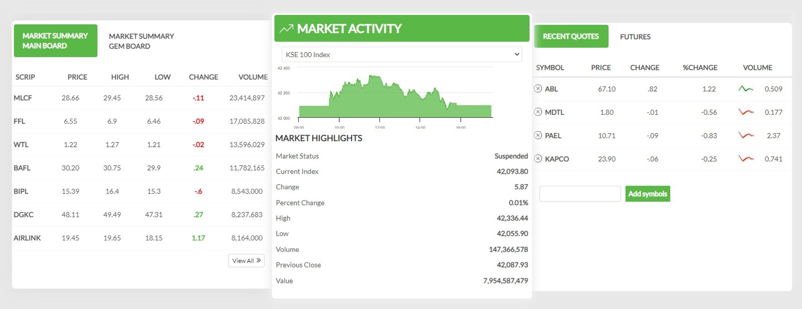 دوسری جانب پاکستان اسٹاک ایکسچینج کا 100 انڈیکس اتار چڑھاؤ کے بعد مثبت زون میں بند ہوا ۔ پی ایس ایکس کا 100 انڈیکس 5 پوائنٹس اضافے کے بعد 42 ہزار 93 پر بند ہوا ۔