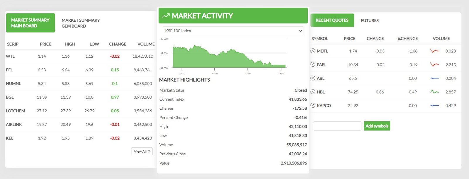 ملک کی حصص مارکیٹ میں آج مندی چھائی رہی۔ پی ایس ایکس کے 100 انڈیکس میں 172 پوائنٹس کی کمی ریکارڈ کی گئی جسکے بعد انڈیکس  41 ہزار 833 کی سطح پر بندہواجوکہ صفر اعشاریہ 41 فیصد کمی ہے ۔