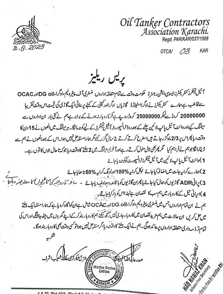 وفاقی حکومت کے لیے ایک نئی مشکل ، آئل ٹینکر کنٹریکٹرز ایسوسی ایشن نے ہڑتال کی دھمکی دے دی ، لوکل کرایا 100 فیصد اور لونگ کرایا 50 فیصد بڑھانے کا مطالبہ کر دیا۔