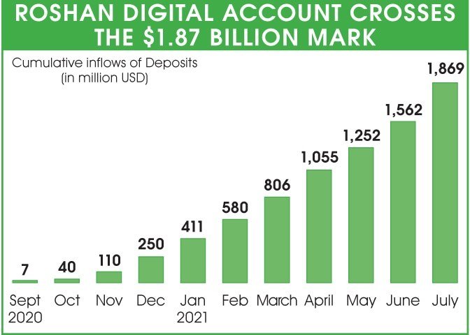 روشن ڈیجیٹل اکاؤنٹ (آر ڈی اے) کے ذریعے جولائی کے اختتام تک رقوم کی پاکستان آمد ایک ارب 87 کروڑ ڈالر تک پہنچ گئی۔ آر ڈی اے اجرا کے بعد موجودہ مالی سال کے پہلے ماہ میں رقم کی آمد دوسری بار بلند ترین سطح پر دیکھی گئی ہے۔