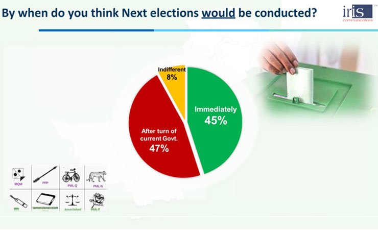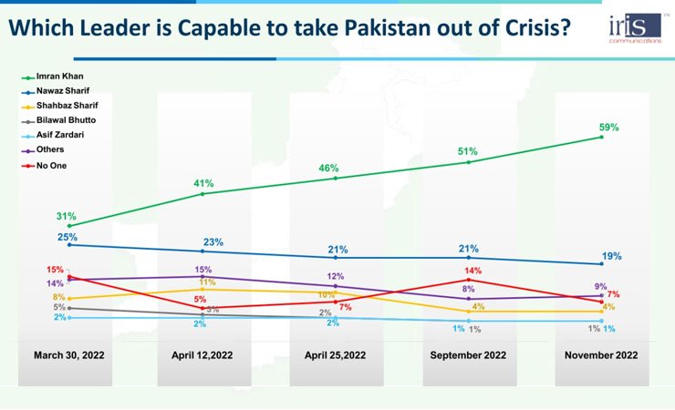 In the latest survey of IRIS Pakistan, 59% of the people of the country declared Imran Khan as their saviour, and 70% of Pakistanis demanded immediate general elections in the country.