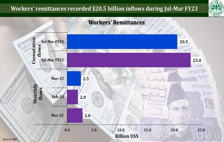 During first 9 months of fiscal year 2022-23, remittances decreased by about 11% to 20.53 billion, while in same period last year, remittances were 20 billion dollars
