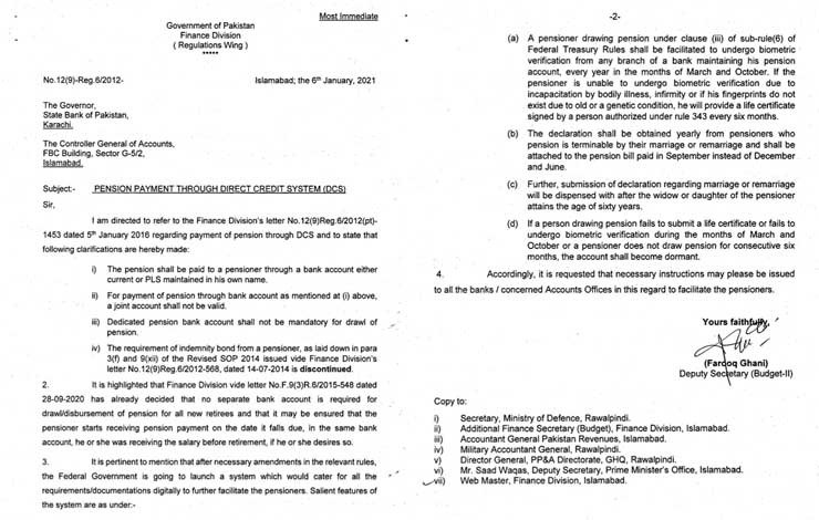 The federal government has issued a notification that reads that it would be mandatory for all retirees in Pakistan to open a bank account in which their pensions would land.