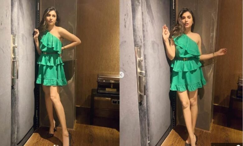 The latest pictures shared by actress and model Amina Ilyas on Instagram are from inside a house, in which the actress is dressed in a dark green color short skirt.