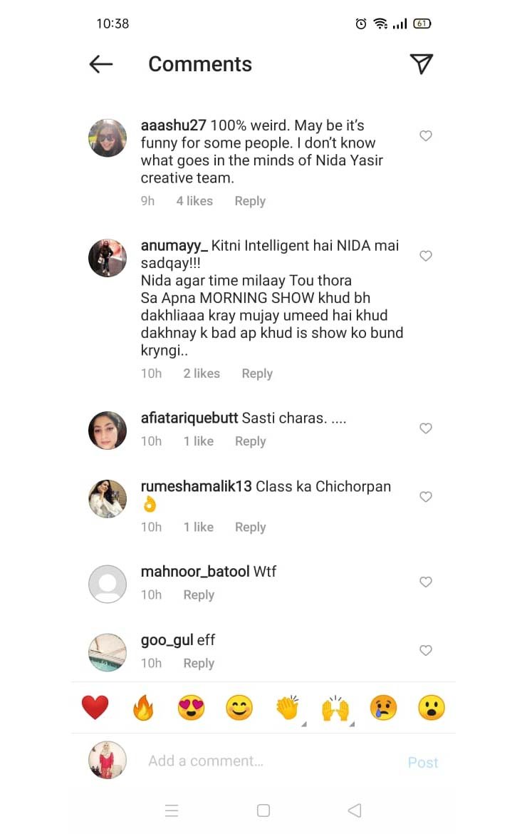 Nida Yasir has been hosting the show for nearly a decade but in striving to gain TRPs, the host has faced strong bashing from the audience multiple times from the views, and this time, it was for the wedding ceremony of the newlywed actress Srha Asghar.