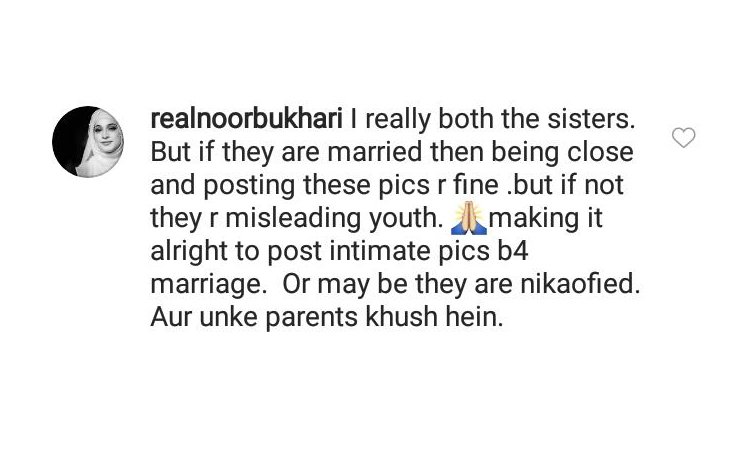The veteran actress commented, “I really like both the sisters. But if they are married then being close and posting these pics r fine but if not they are misleading youth. Making it alright to post intimate pics before marriage. Or maybe they are nikkahfied aur unke parents khush hein.”