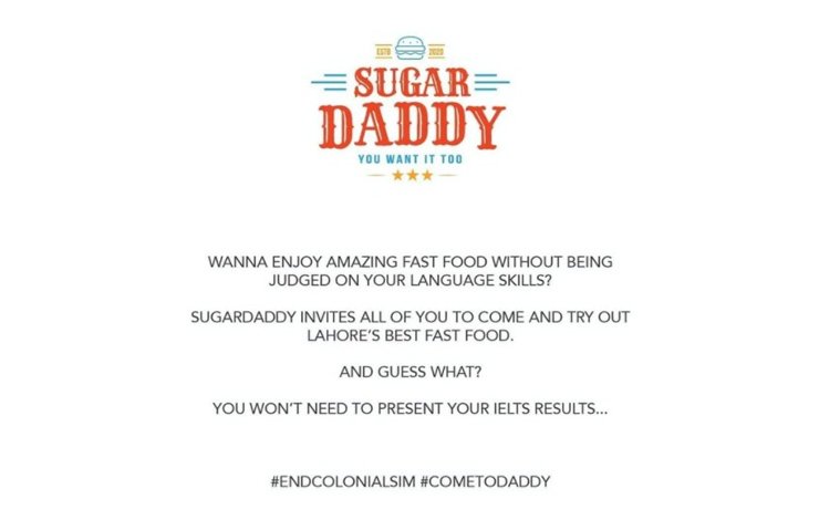One of the recent mocking attempts against Café Cannoli that fails is Sugar Daddy’s marketing campaign inviting the citizens of Lahore to try out the restaurant without being judged for language skills.