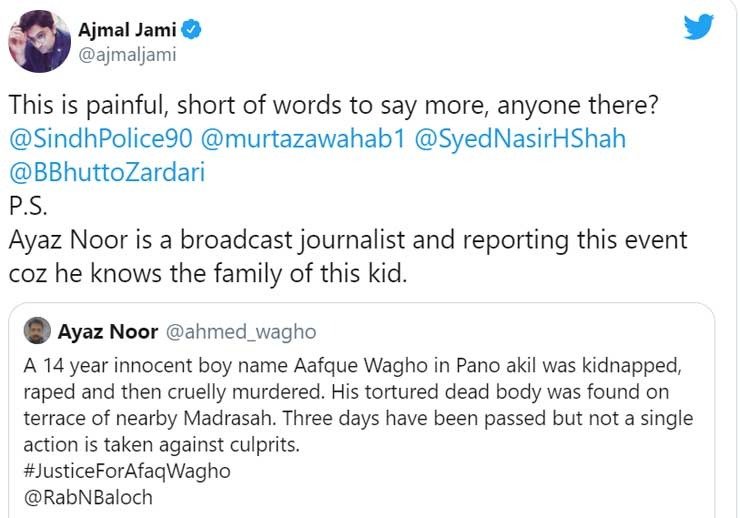 In his tweet, Ayaz noted that the authorities had not taken notice of the brutal incident even after three days of the incident. He tried to start a trend using the hashtag #JusticeForAfaqWagho.
