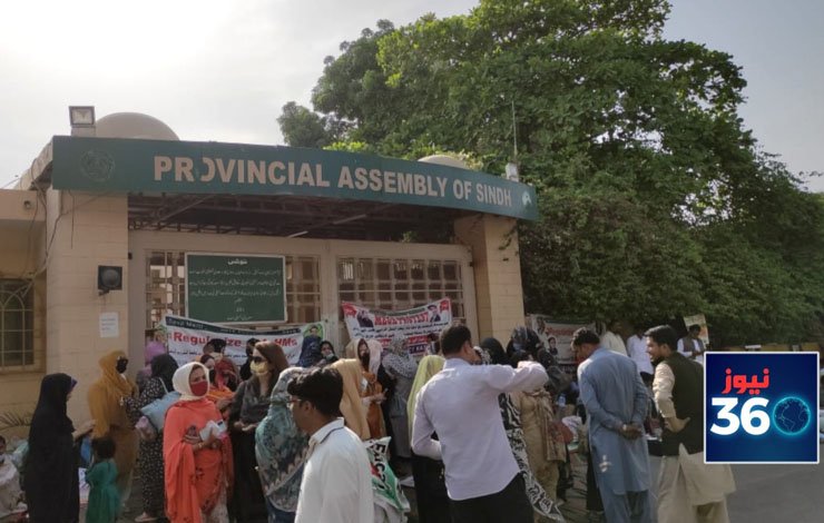 Dozens of educators chanted slogans outside Sindh Assembly against humiliation and torture of female counterparts