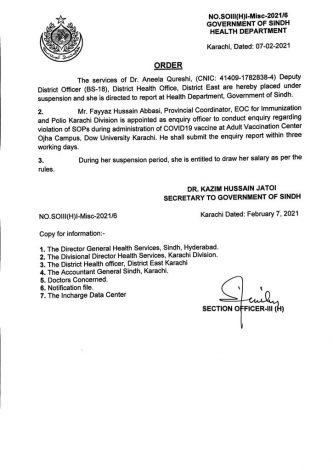 National Command and Operation Centre (NCOC) Head Asad Umar, who is the brother of Muhammad Zubair, also took notice of the matter and suspended Deputy District Officer Dr Aneela Qureshi on violation of vaccination’s strictures.
