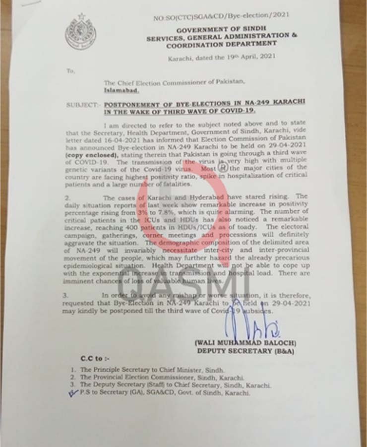 In a letter to the Election Commission of Pakistan (ECP), the Sindh government sought a delay in the by-poll as it cited the worsening coronavirus crisis in the province.
