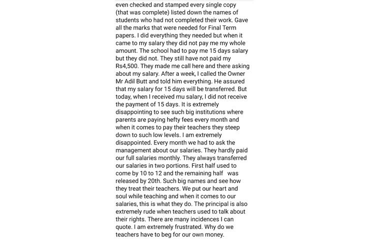 Sadaf expressed her disappointment and said, “It is extremely disappointing to see such big institutions where parents are paying hefty fees every month and when it comes to paying their teachers they step down to such low levels”.