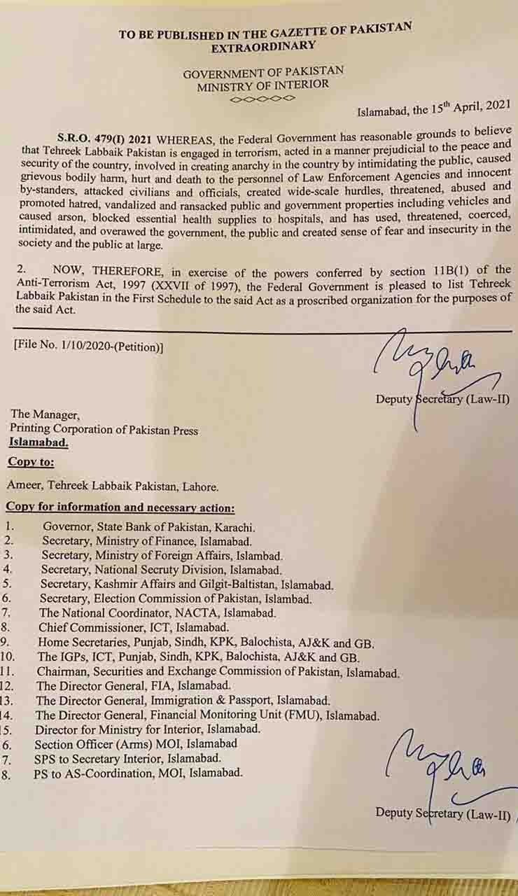 In the last few days, TLP has carried out certain activities that pose threat to state’s safety and security and have disturbed the law-and-order situation in multiple cities.