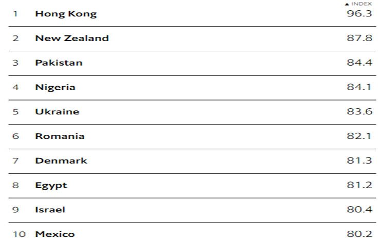The other top countries in the list are Hong Kong and New Zealand with index scores of 96.3 and 87.8 respectively.
