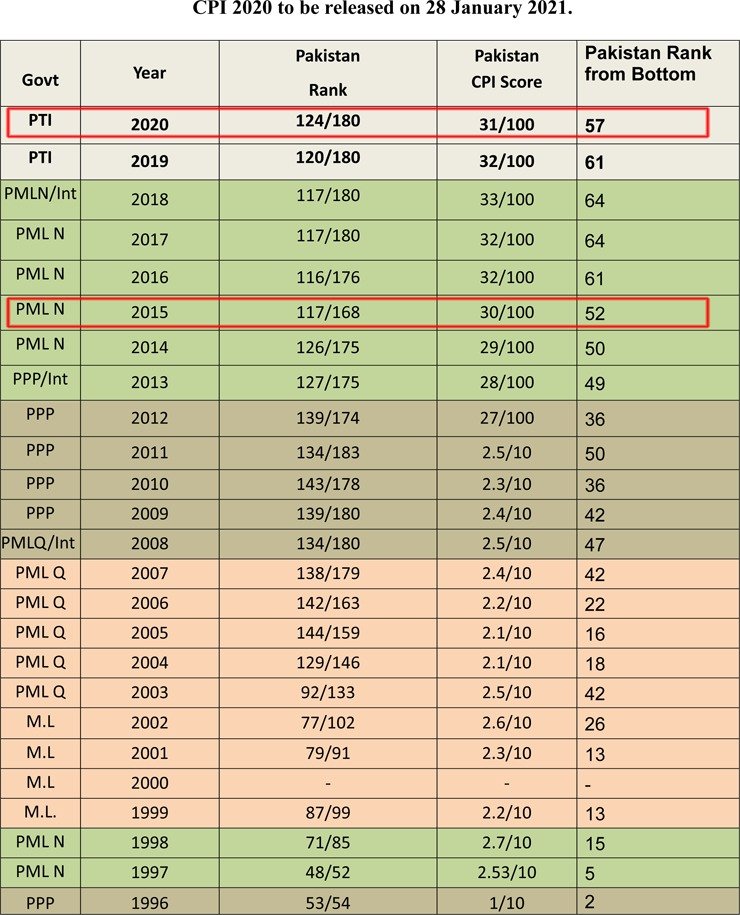 According to the Corruption Perceptions Index (CPI) 2020, Pakistan’s ranking is 124 out of 180 countries, Pakistan had the same corruption rate in 2015 when Pakistan Muslim League-Nawaz PML-N was in power; the rate has plummeted drastically.