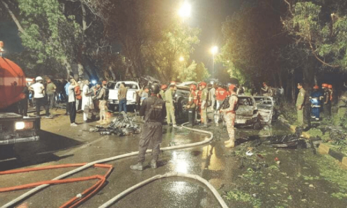 Briefing reporters at the scene, Deputy Inspector General (East) Capt (retd) Azfar Mahesar confirmed that two people were killed in the explosion, which also destroyed seven vehicles.