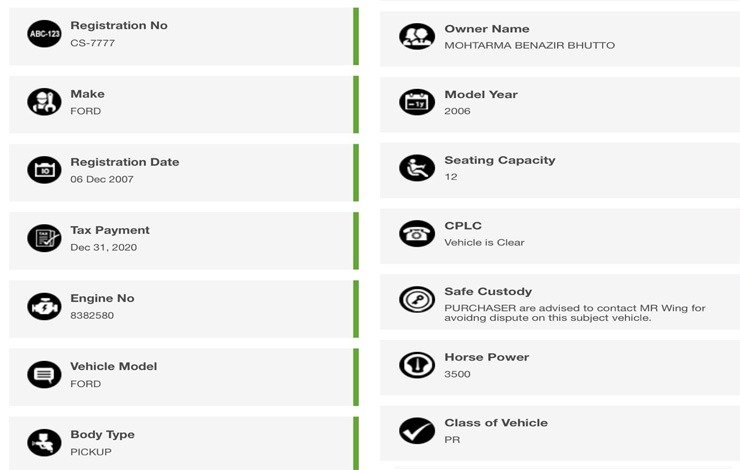 However, a vehicle, registered under the name of Benazir Bhutto, was bought just three weeks before her assassination after a mass gathering in the garrison city.