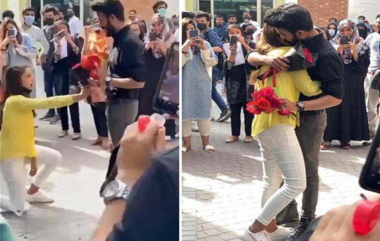 A video on the internet went viral on Friday where a female student sank to her knees and proposed to a male student