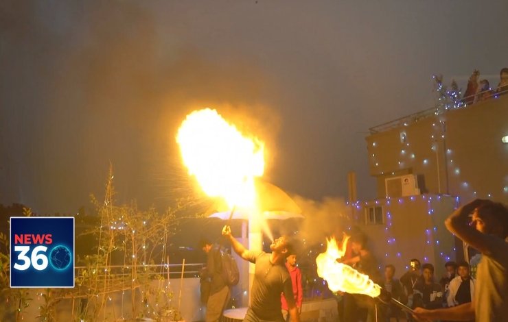 Spectators enjoy special events such as kite flying from their roofs. Hundreds of people gathered on rooftops to see the fireworks which light up the night sky and flame-eaters also display their skills leaving the audience amazed at the festival.