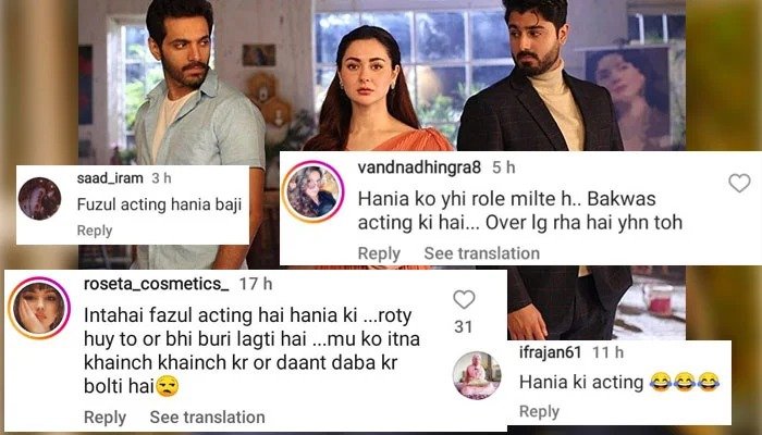 سوشل میڈیا صارفین نے ڈرامے میں ہانیہ عامر کی اداکاری کو انتہائی فضول قرار دیدیا۔ایک صارف نے لکھا کہ”ہانیہ کی اداکاری انتہائی فضول ہے، روتے ہوئے تو اور بھی بری لگتی ہے،منہ کو اتنا کھینچ کھینچ کر اور دانتوں کو دبا دبا کر بولتی ہے۔ایک اور صارف نے لکھاکہ”ہانیہ کو یہی کردار ملتے ہیں،بکواس اداکاری کی ہے، یہ کردار تو بالکل اوور لگ رہا ہے“۔