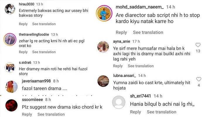 ایک صارف نے لکھاکہ”یہ صرف میرے ہمسفر میں ہالا بن کر اچھی لگی تھی،اس ڈرامے میں بالکل اچھی نہیں لگ رہی“۔ایک صارف نے لکھا کہ”ارے ڈائریکٹر صاحب اسکرپٹ نہیں ہے تو ڈرامہ بند کردو،کیوں ناٹک کررہے ہو“۔