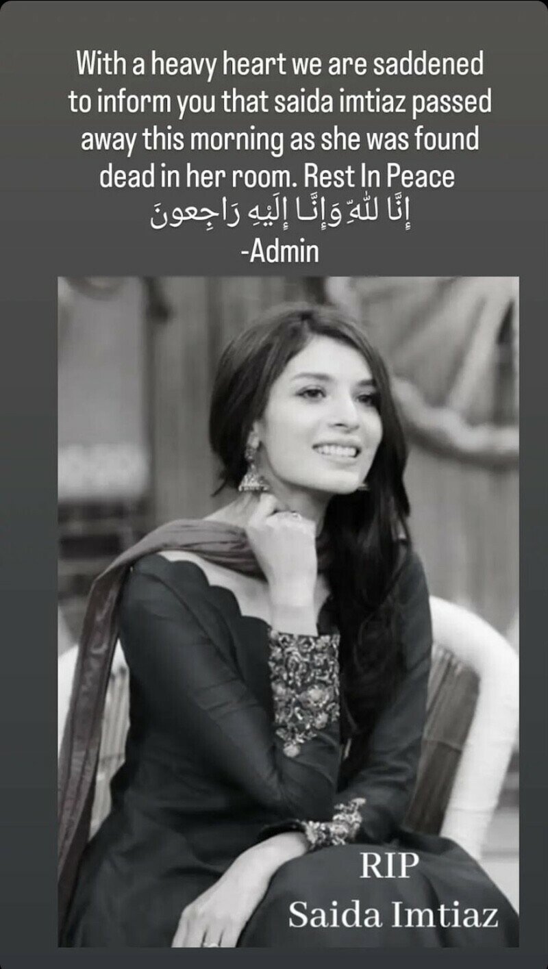 ماڈل و اداکارہ سعیدہ امتیاز آج صبح اپنے کمرے میں مردہ پائی گئیں، تصدیق شدہ انسٹاگرام اکاؤنٹ پر شیئر کی گئی اسٹوری میں دعویٰ: اداکارہ کے وکیل اور دوست نے خبر کی تردید کردی، انسٹاگرام ہیک ہونے کا شبہ