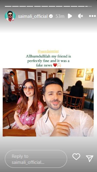 تاہم سعیدہ امتیاز کے دوست ماڈل صآئم علی نے بھی سعیدہ امتیاز کی موت کی خبر کو جعلی قرار دے دیا۔ صائم علی نے اپنی انسٹاگرام اسٹوری میں لکھاکہ الحمدللہ میری دوست بالکل ٹھیک ہے اور وہ ایک جھوٹی خبر تھی۔