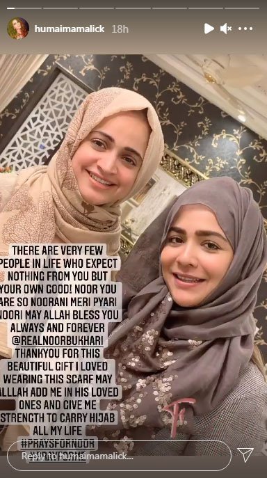 حمائمہ ملک نے اپنی انسٹاگرام اسٹوری میں نور بخاری کے ساتھ تصویر شیئر کی۔ جس میں دونوں اداکارائیں حجاب پہنے دکھائی دیں۔ حمائمہ نے تصویر کے ساتھ لکھا کہ زندگی میں کچھ لوگ ایسے ہوتے ہیں جو آپ سے کسی قسم کی توقع نہیں رکھتے ہیں لیکن آپ کا اچھا چاہتے ہیں نور اُن میں سے ایک ہیں۔