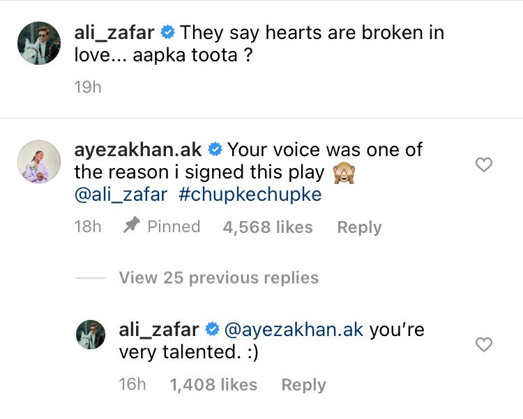 فوٹو شیئرنگ ایپ انسٹاگرام پر علی ظفر نے اپنی سریلی آواز میں گانا گنگناتے ہوئے ایک ویڈیو شیئر کی جس پر عائزہ خان نے علی ظفر مخاطب کرتے ہوئے کمنٹ میں بتایا کہ چپکے چپکے میں کام کرنے کی ایک بڑی وجہ یہ تھی کہ اس کا ٹائٹل سانگ آپ نے گایا تھا۔ جس پر علی ظفر نے ان کی تعریف کرتے ہوئے کہا کہ وہ ایک باصلاحیت اداکارہ ہیں۔
