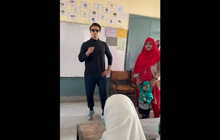 وائرل ویڈیو میں دیکھا جاسکتا ہے کہ گلوکار علی ظفر ایک کلاس روم کھڑے ہیں ، انہوں نے ٹیچرز اور اسٹوڈنٹس سے بات چیت کی اور نئی کتابوں اور سلیبس کے حوالے سے معلومات حاصل کیں۔