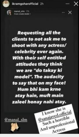 میک اپ آرٹسٹ اکرام گوہر نے منال سلیم کی اسٹوری شیئر کرتے ہوئے لکھا کہ وہ جانتے ہیں کہ وہ اداکارہ ثنا جاوید کی بات کر رہی ہیں،ساتھ ہی انہوں نے ثنا جاوید کوغیر پیشہ ورانہ اور خوفناک شخصیت بھی قرار دیا۔