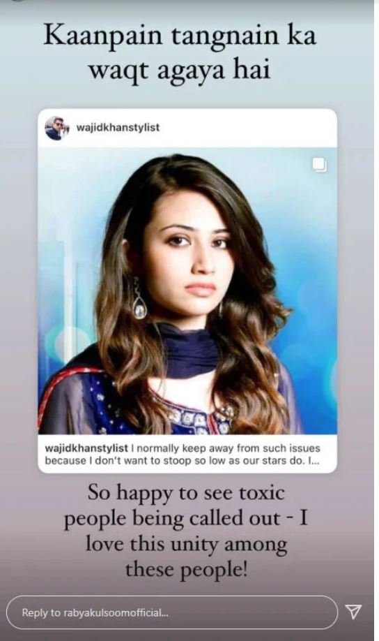 اداکارہ رابعہ کلثوم نے واجد خان کی پوسٹ کا اسکرین شاٹ شیئر کرتے ہوئے ان کے ساتھ ہمدردی کا اظہار کیا۔اداکارہ نے لکھا کہ اب کانپیں ٹانگنے کا وقت آگیا ہے۔