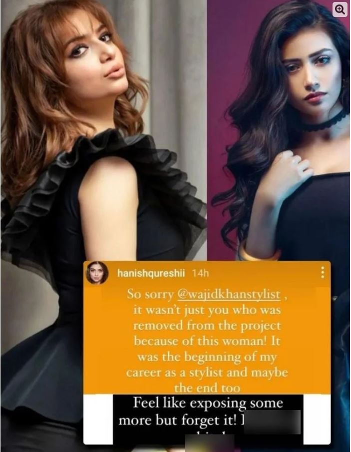 ہانش قریشی نے واجد خان کو مخاطب کرتے ہوئے اپنی انسٹاگرام اسٹوری میں لکھا کہ واجد خان صرف آپ ہی نہیں ہیں جنہیں اس عورت کی وجہ سے کسی پروجیکٹ سے نکالا گیا، بطور اسٹائلسٹ اپنے کیریئر کی ابتدا یا شاید اختتام پر میرے ساتھ بھی کچھ ایسا ہی ہوا۔