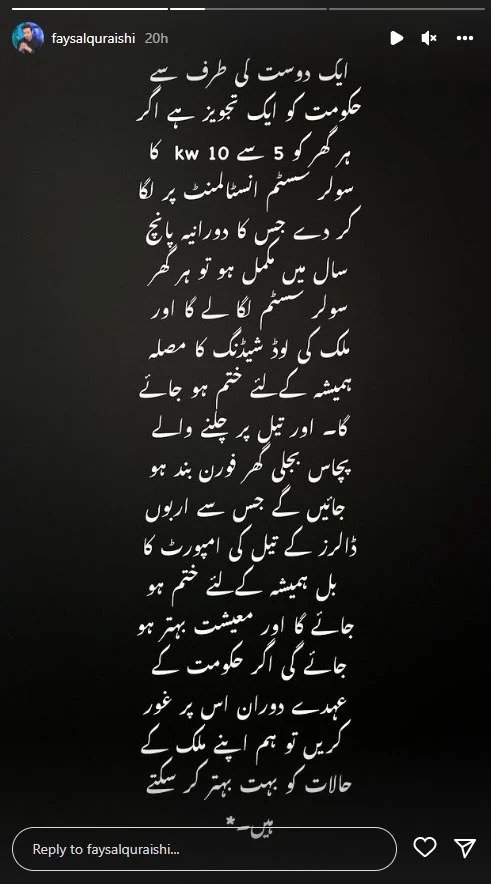 فیصل قریشی نے اپنے ٹوئٹ میں لکھا کہ ایک دوست کی طرف سے حکومت کو ایک تجویز ہے کہ اگر ہر گھر کو 5 سے 6 کلوواٹ کا سولر سسٹم قسطوں پر دے جسکا دورانیہ5 سال میں مکمل ہوتو ہر گھر سولر سسٹم لگالے گا اور ملک کی لوڈ شیڈنگ کا مسئلہ ہمیشہ کیلیے ختم ہوجائے گا ۔