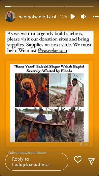 گلوکارہ و اداکارہ حدیقہ کیانی اور منیبہ مزاری اور دیگر نے وہاب علی بگٹی سمیت بلوچستان کے سیلاب متاثرین کیلیے امداد کی اپیل کی ہے۔