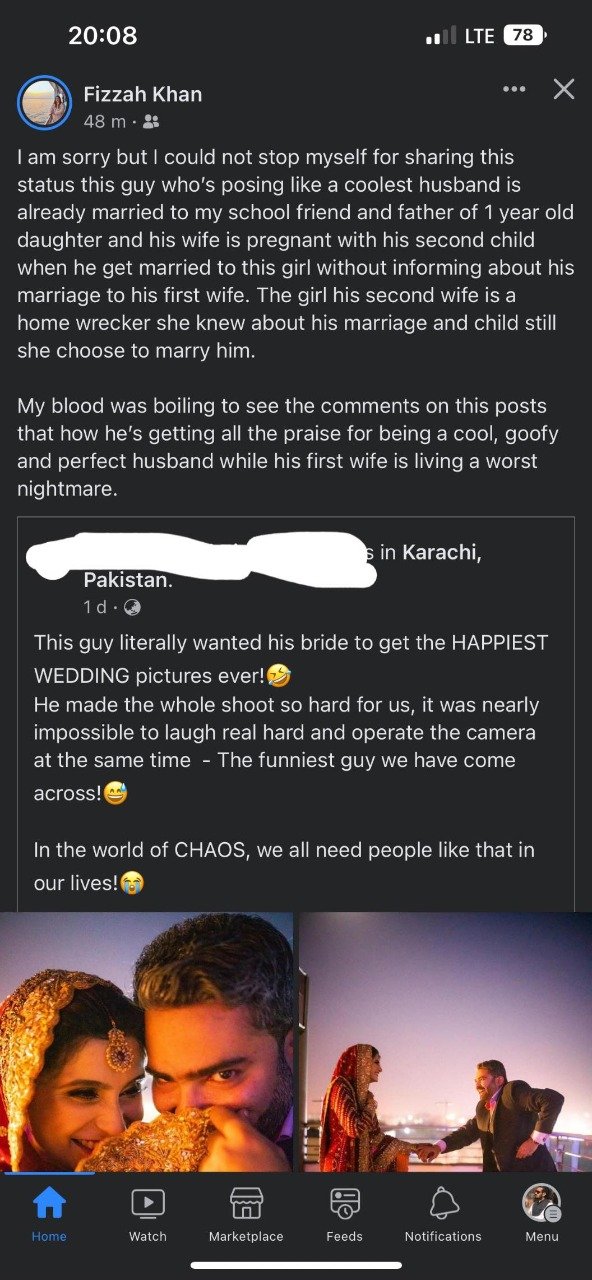 حاملہ پہلی بیوی کی اجازت کے بغیر دوسری شادی کرنے والے دلہے کی تصاویر سوشل میڈیا پلیٹ فارم وائرل ہوگئیں۔ پوسٹ جسے بعد میں حذف کر دیا گیاتھا کہ اس میں لڑکا چاہتا تھا اس کی دلہن اب تک کی سب سے خوش کن شادی کی تصویریں حاصل کرے۔
