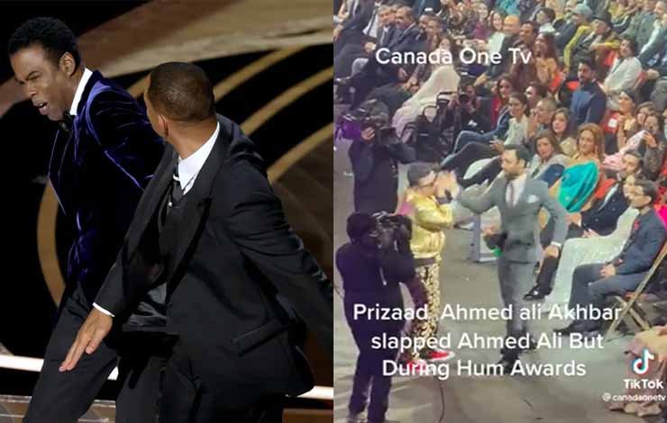 ٹوئٹر پر وائرل ہونے والی وڈیو میں میزبان احمد علی بٹ اور اداکار احمد علی اکبر کو آسکر ایوارڈز 2022 کے دوران ہالی ووڈ سپراسٹار ول اسمتھ اور کامیڈین کرس راک کے درمیان پیش آنے والے ناخوشگوار واقعے کی نقل اتارتے ہوئے دیکھاجاسکتا ہے۔