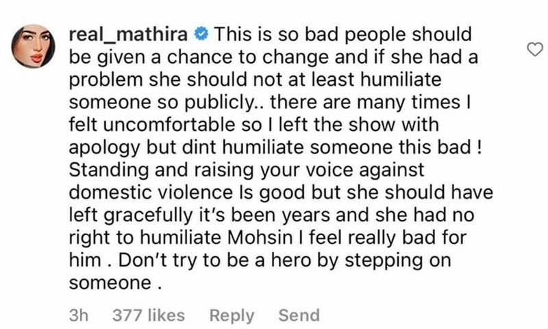 پروگرام کے کلپ پر تبصرہ کرتے ہوئے متھیرا نے لکھاکہ  گھریلو تشدد کے خلاف کھڑا ہونا اچھی بات ہے لیکن وہ اچھے طریقے سے بھی شو کو چھوڑ سکتی تھیں۔متھیرا نے مزید لکھا کہ ان کے ساتھ بھی متعدد شوز میں مسائل ہوئے لیکن انہوں نے کسی دوسرے کی تضحیک کیے بغیر شو کو احترام سے چھوڑا۔