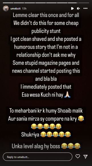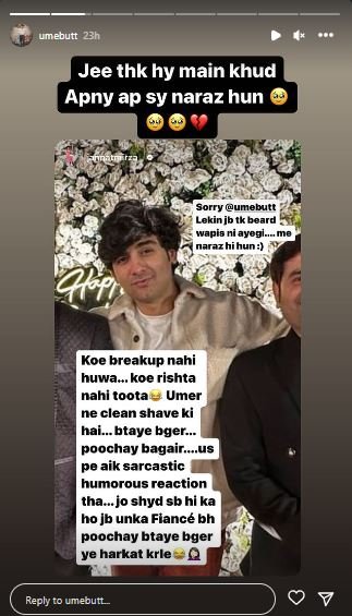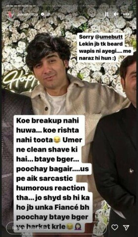 انسٹاگرام پر اسٹوریز کی ایک سیریز میں انہوں نے اس مذاق سے پردہ اٹھاتے ہوئے کہا کہ عمر بٹ نے انہیں بغیر بتائے کلین شیو کروالی جس پرانہوں نے بھی مذاق میں تعلق ختم کرنے کا اعلان کردیا۔
