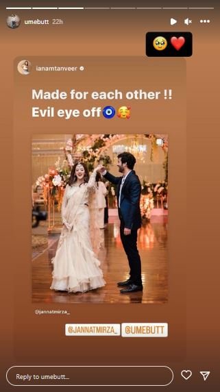 عمر بٹ نے ایک اور اسٹوری میں جنت مرزا اور اپنی تصویر شیئر کرتے ہوئے لکھا کہ ایک دوسرے کیلیے بنے ہیں ، اللہ بری نظر سے بچائے۔