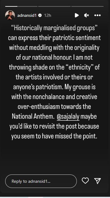 انہوں نے کہاکہ” میں کسی  فنکاروں کی نسل یا ان کی یا کسی کی حب الوطنی پر روشنی نہیں ڈال رہا ،میری بے چینی کی وکہ قومی ترانے کے ساتھ لاپروائی اور تخلیقی حد سے زیادہ جوش و خروش ہے۔سجل علی  ہو سکتا ہے کہ آپ اس پوسٹ کو دوبارہ دیکھنا چاہیں کیونکہ ایسا لگتا ہے کہ آپ نے پوائنٹ کو کھو دیا ہے“۔
