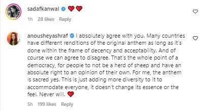 سجل علی کی انسٹاگرام پوسٹ پر تبصرہ کرتے ہوئے صدف کنول نےپسندیدگی کا اظہار کیا جبکہ انوشے اشرف نے لکھا کہ میں تم  سے بالکل متفق ہوں۔ بہت سے ممالک میں اصل ترانے کو مختلف انداز میں پیش کیا جاتا ہے بس اسے شائستگی اور قبولیت کے دائر ے میں رکھاجاتا ہے ۔
