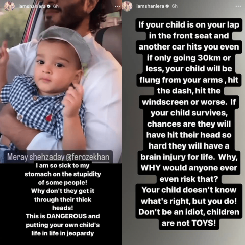 شنیرا اکرم نے اپنی انسٹاگرام اسٹوری میں اداکار فیروز خان کی ایک وڈیوشیئر کی ہے جس میں وہ اپنی بیٹی کو گود میں بٹھا کر گاڑی چلا رہے ہیں۔شنیرا اکرم نے لکھا کہ” کچھ لوگوں کی حماقت پر اپنے پیٹ میں درد محسوس کررہی ہوں،ان کی موٹی کھوپڑیوں میں یہ بات کیوں نہیں سماتی کہ یہ خطرناک ہے اور آپ اپنے بچے کی جان خطرے میں ڈال رہے ہیں“ ۔
