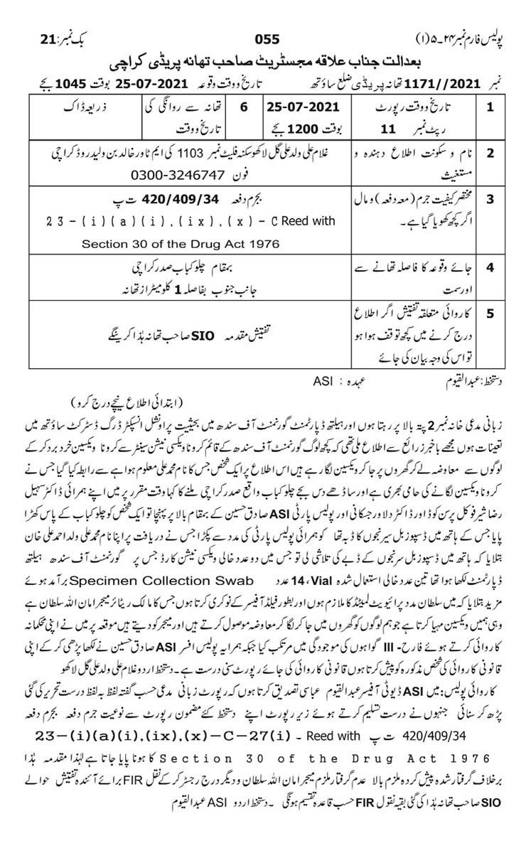 کراچی میں بھاری رقم کے عوض گھر گھر جا کر کرونا سے بچاؤ کی ویکسین لگانے والے 2 ملزمان کو 25 جولائی کو گرفتار کیا گیا تھا اور انہی کی نشاندہی پر ساؤتھ زون پولیس نے ڈیفنس فیز ٹو میں ہیلتھ سروسز فراہم کرنے والی نجی کمپنی پر چھاپا مارا اور سائنو فام، کنسائنو اور سائنو ویک کی 513 خالی شیشیاں برآمد کرلیں۔ تفتیشی حکام کا دعویٰ ہے کہ ملزمان کی جانب سے 60 افراد کو فائزر ویکسین لگائی گئی جس کے دستاویزات ملے ہیں۔ ان دستاویزات کو کیس پراپرٹی بنالیا گیا ہے۔
