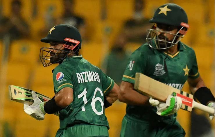 پاکستان کی اننگز کا آغاز کپتان بابر اعظم اور وکٹ کیپر محمد رضوان نے کیا۔ دونوں کھلاڑیوں نے پراعتماد طریقے سے کھیلتے ہوئے اسکور کو 71 رنز تک پہنچایا ۔ اس موقع پر ایک غلط شارٹ کھیلتے ہوئے کپتان بابر اعظم باؤنڈری لائن کے قریب کیچ آؤٹ ہو گئے۔ انہوں نے 41 گیندوں پر 50 رنز بنائے تھے۔