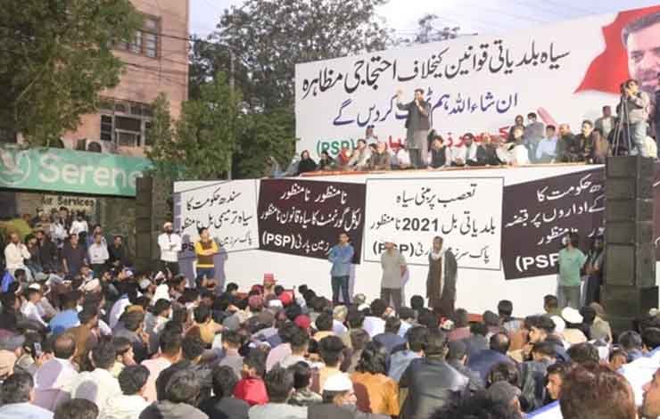 سربراہ پی ایس پی نے فوارہ چوک پر احتجاجی دھرنے کے عوام سے خطاب کرتے ہوئے کہا کہ ہم عوام کی بہتری کے لیے نکلے ہیں، ملک کی خوشحالی کے لیے کراچی کے نوجوانوں کا بہت بڑا کردار ہے۔ انہوں نے مزید کہا کہ ان کی جماعت سندھ کے متنازعہ لوکل گورنمنٹ قانون کو قبول نہیں کرتی۔